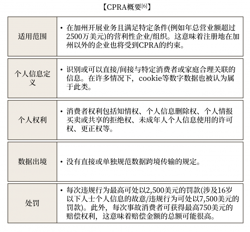 正在美国,各州的现私保不尽不异。《消费者现私法》(CCPA) 及其修订版《现私权法》(CPRA) 建立了取 PR 雷同的法令律例,并为消费者供给了更大的数据通明度和节制权。